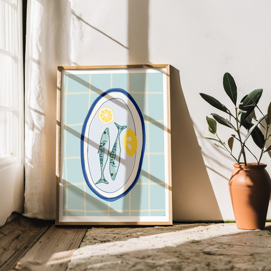 Sardiner på Fat Poster – Trendig Väggkonst för Kök i Medelhavsstil