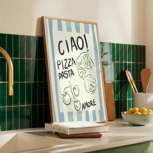 Ciao Pizza Pasta Amore – Illustrerad matkonst med blå ränder