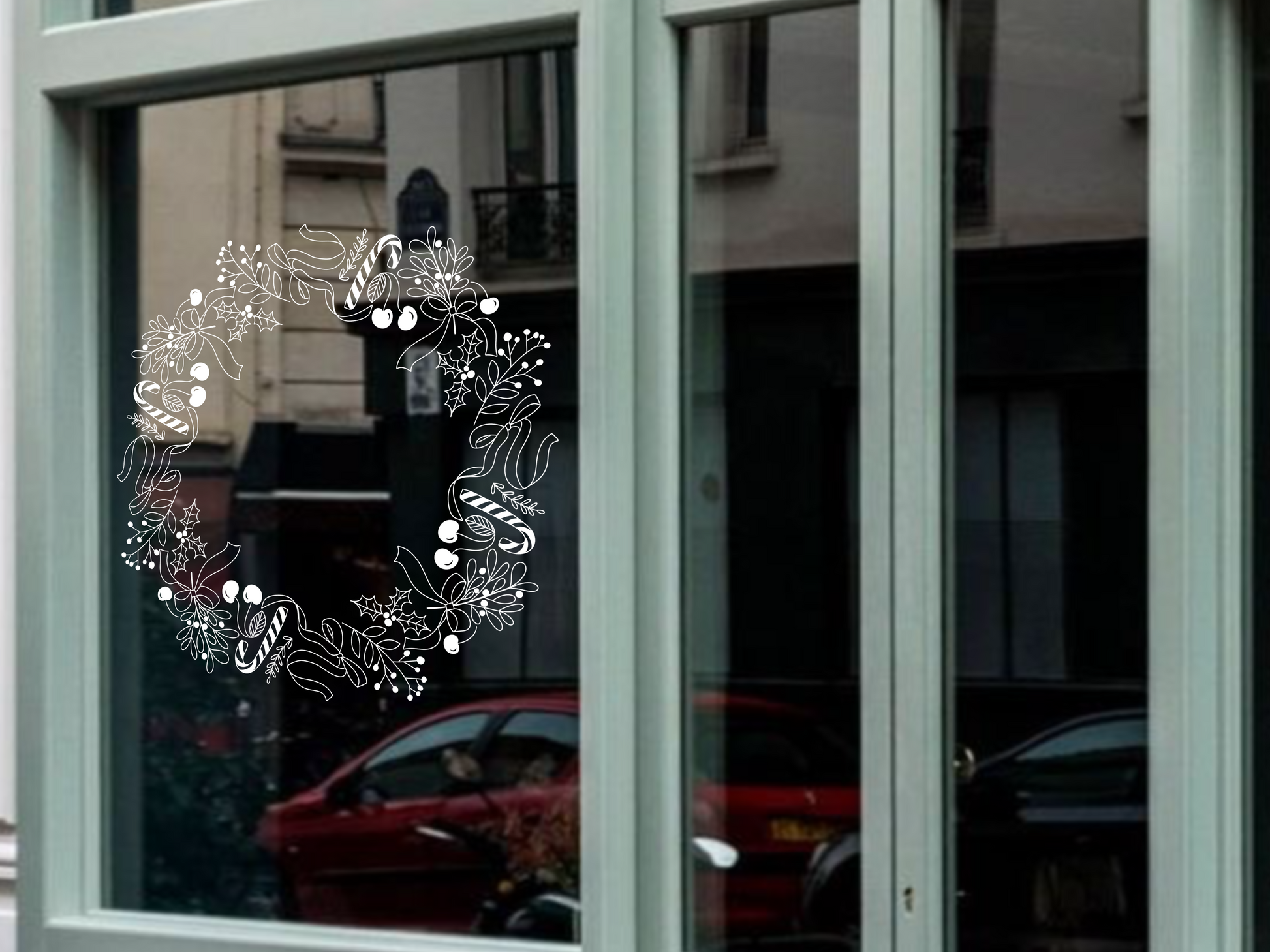This digital window template is inspired by Christmas, filled with candy canes, twigs, berries and playful elements. Perfect for large windows, storefronts, mirrors or decorative signs.